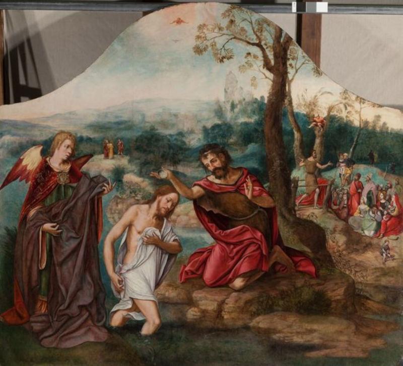 « Jésus baptisé par saint Jean Baptiste dans le Jourdain », par un anonyme hollandais, du VIe siècle. Panneau central d’un retable (tryptique). Peinture à l’huile sur panneau de bois. Musée des Augustins , domaine public, via Wikimedia Commons. Dans les commentaires qui suivent, certains passages peuvent être surlignés en bleu, couleur de la liberté ; justement…