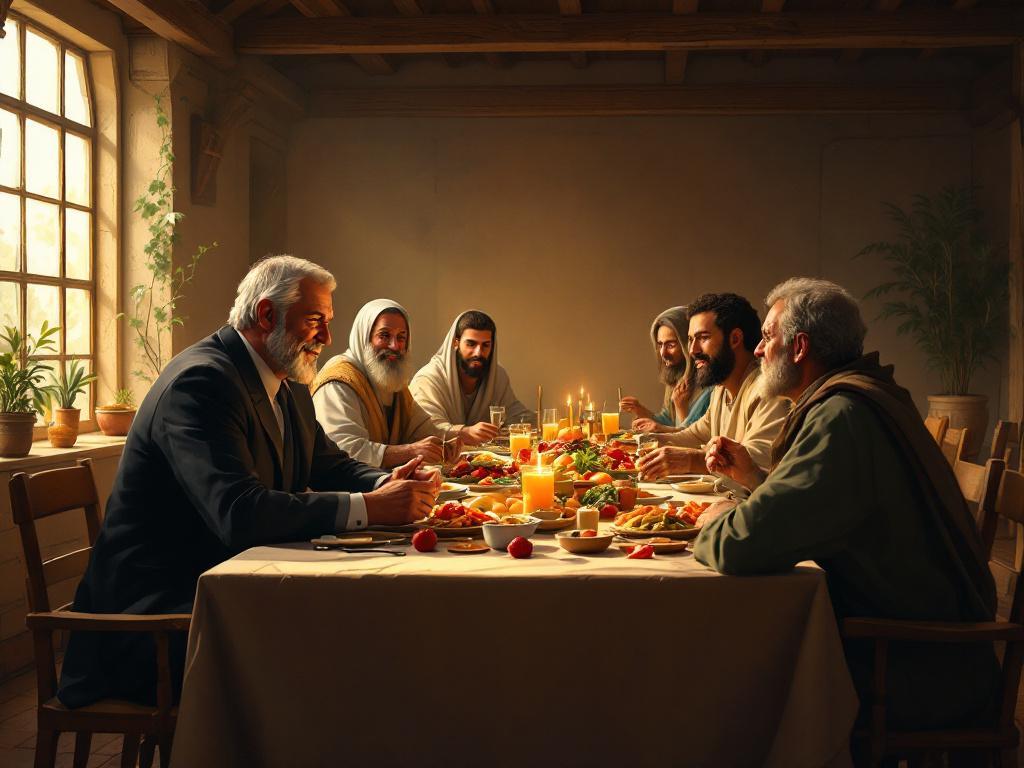 « Au contraire, quand tu donnes une réception, invite des pauvres, des estropiés, des boiteux, des aveugles ; heureux seras-tu car ils n’ont rien à te donner en retour… »Image générée par Le Chat (Mistral-AI).