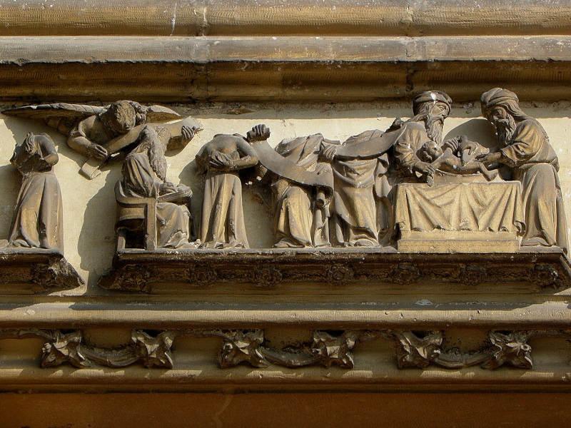 Façade sud de la basilique Notre-Dame de l’Épine (51). Linteau du portail du transept sud. Histoire de saint Jean Baptiste. Zacharie nommant Jean Baptiste et circoncision de saint Jean Baptiste.