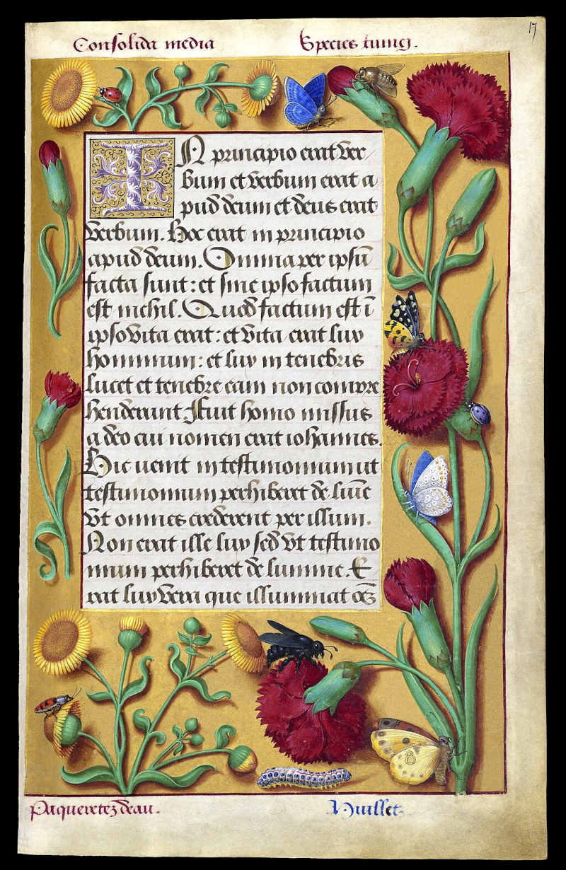 Le folio présenté donne le prologue de l’évangile selon saint Jean : « In principio erat Verbum, et Verbum erat apud Deum, et Deus erat Verbum. Hoc erat in principio apud Deum. Omnia per ipsum facta sunt, et sine ipso factum est nihil quod factum est. In ipso vita erat, et vita erat lux hominum: et lux in tenebris lucet, et tenebrae eam non comprehenderunt. Fuit homo missus a Deo, cui nomen erat Joannes. Hic venit in testimonium, ut testimonium perhiberet de lumine, ut omnes crederent per illum. Non erat ille lux, sed ut testimonium perhiberet de lumine. Erat lux vera quae illuminat om(nem hominem etc…) ».