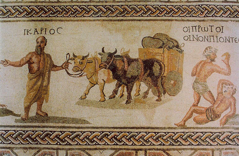 Mosaïque du site de Nea Paphos représentant Icarios conduisant un char transportant des outres de vin. Sur la droite, deux bergers ivres. Explications ici.