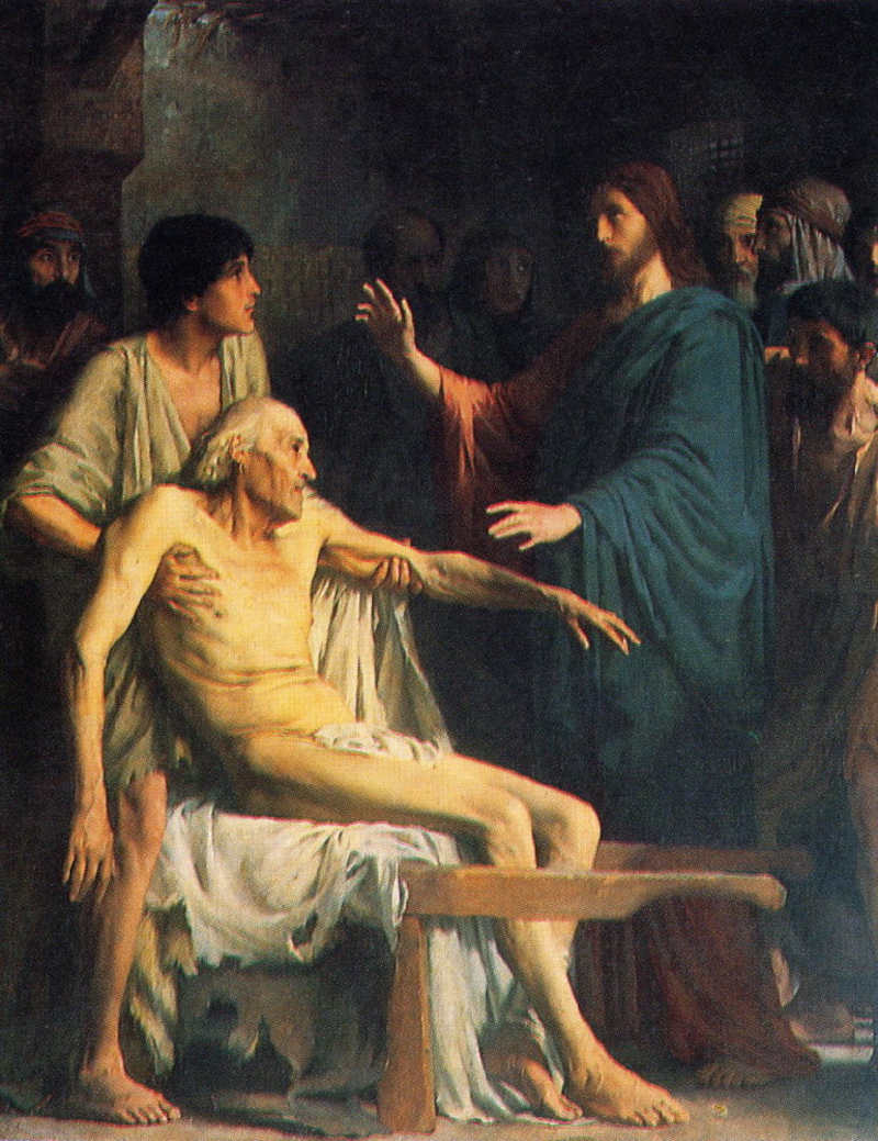 Pourtant, à Capharnaüm, et c’est probablement l’une des choses que Marc veut faire remarquer à ses lecteurs, les scribes auraient pu trouver une occasion d’ouvrir leurs yeux et leurs coeurs ; car Dieu, lui, n’a pas désavoué les prétentions de Jésus : la guérison corporelle du paralytique vient prouver le pouvoir qu’il tient de son Père ; c’est bien le pouvoir universel promis au Fils de l’homme dans le texte du prophète Daniel (Dn 7, 14).